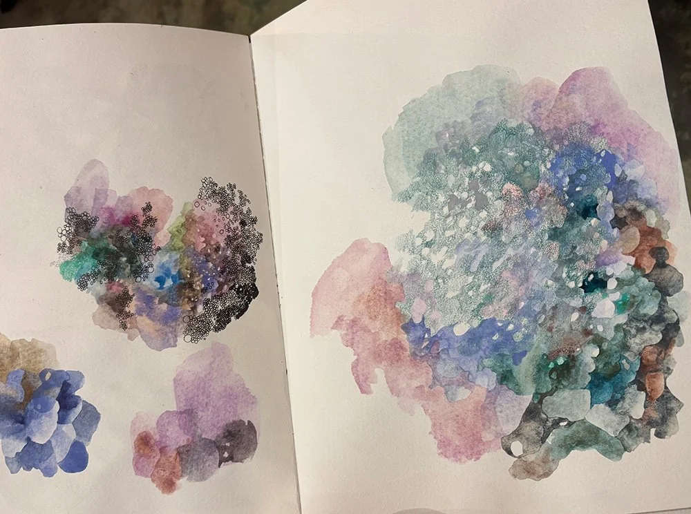 More intuitive mark-making, alluding to natural forms, using coloured pencil, watercolour and pen.