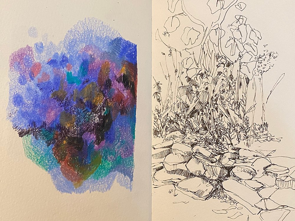 A page from an art journal from a few years back. On the left, a coloured pencil study and on the right, a quick ink sketch of a corner of my garden.